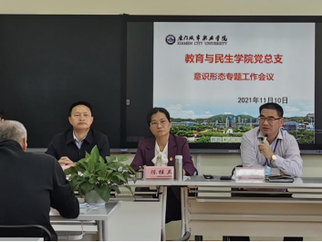 为进一步加强意识形态工作,落实立德树人根本任务,2021年11月10日下午,教育与民生学院党总支在匠心楼A区315召开教意识形态专题工作会议,总支全体党员参加。会议由党总支书记岳世川主持,校党委委员、纪委书记陈桂兰出席。教育与民生学院院长曹绍炼列席。